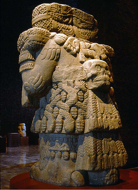 En el museo de Antropología e Historia de la ciudad de México DF. Existe un monolito de impresionante tetra significado: En lo alto de éste, por entre el anillo de su cuerpo enroscado, asoma una preciosa y grande serpiente de doble cara, la cual ve hacia delante y hacia atrás, como el Jano de la religión Greco- Romana. Redondos y penetrantes ojos, fauces entreabiertas de las cuales, debajo de los cuatro incisivos superiores, curvos y afilados con las puntas hacia fuera, cuelgan grandes y bífidas lenguas.